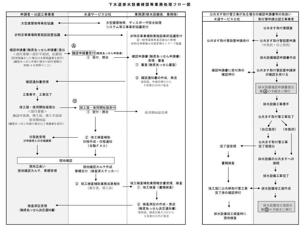 以下のフロー図では、下水道排水設備工事における確認(申請)から検査、使用開始までの事務手続きの全体像を整理しています。