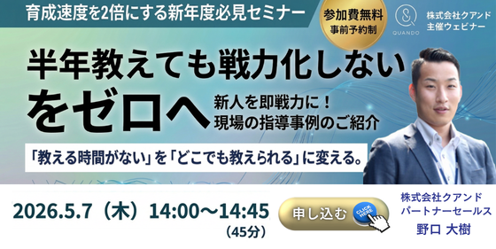 , title= }]}, css={}, child_css={}, id=summary, name=summary, type=module, order=11, smart_type=null, styles={}}, recommend={body={texts=[若手の立ち上がりを早めたい現場責任者の方, 教育負担を減らしながら成果を出したい方, 属人化しない育成の仕組みを構築したい方, DXの他社事例を知りたい]}, css={}, child_css={}, id=recommend, name=recommend, type=module, order=8, smart_type=null, styles={}}, speaker={body={items=[{company=株式会社クアンド パートナーセールス, discription=, speaker__image={image={alt=名称未設定のデザイン (4), height=500, loading=lazy, max_height=500, max_width=500, size_type=auto, src=https://9387152.fs1.hubspotusercontent-na2.net/hubfs/9387152/%E3%83%A1%E3%83%AB%E3%83%9E%E3%82%AC/%E5%90%8D%E7%A7%B0%E6%9C%AA%E8%A8%AD%E5%AE%9A%E3%81%AE%E3%83%87%E3%82%B6%E3%82%A4%E3%83%B3%20(4).png, width=500}}, speaker_name=野口 大樹}]}, css={}, child_css={}, id=speaker, name=speaker, type=module, order=10, smart_type=null, styles={}}, form={body={form={form_id=74abf6ce-8366-4ed3-a47e-675fc5ddbab3, form_type=HUBSPOT, gotowebinar_webinar_key=null, message=フォームをご送信いただき、ありがとうございます。, response_type=inline, webinar_id=null, webinar_source=null}, module_id=1155238}, css={}, child_css={}, id=form, name=form, type=module, order=13, label=null, smart_type=null, styles={}, module_id=1155238, deleted_at=1773879720917}}